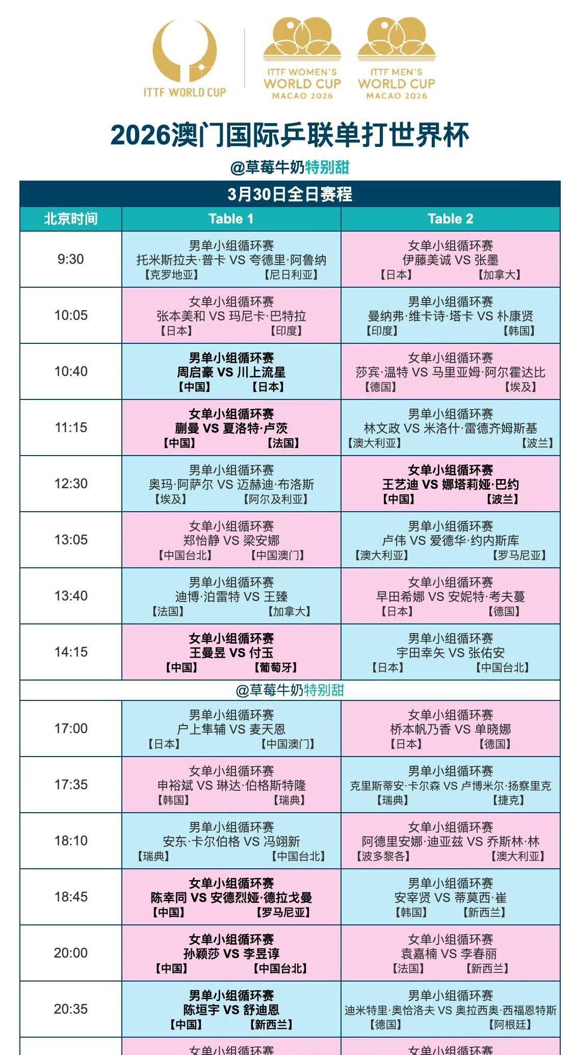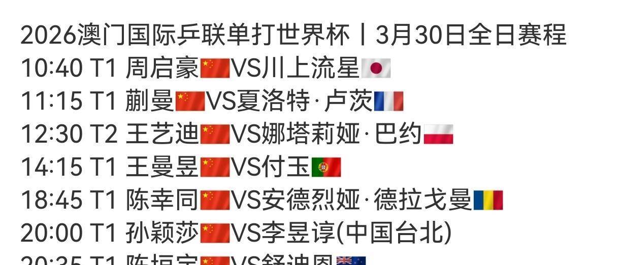 今天最早出场的是周启豪,时间定在上午10点40分。 他这个对手可不简单,是日本16岁的小将川上流星。 这小孩去年拿了世青赛冠军,打法专门模仿王楚钦,发球和前三板特别像。 他之前赢过咱们国青队的温瑞博、李和宸,冲击力很强。 周启豪虽然经验多,但这场是遭遇战,线分,蒯曼要对阵法国的夏洛特·卢茨。 她们俩四年前打过一次,蒯曼赢了。 现在蒯曼实力厚实不少,正常打的线点半,王艺迪上场,她的对手是波兰的娜塔莉娅·巴约。 下午2点15分,王曼昱对阵葡萄牙的老将付玉。 这两场球,王艺迪和王曼昱以前都跟对手交过手,只要自己不出问题,赢面都比较大。