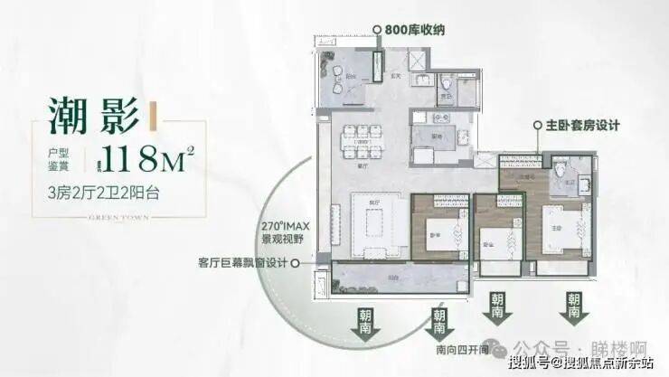 四面宽朝南、南北通透对流双景观、主卧L型扩景飘窗,沉浸式景观尊享、强大收纳系统。